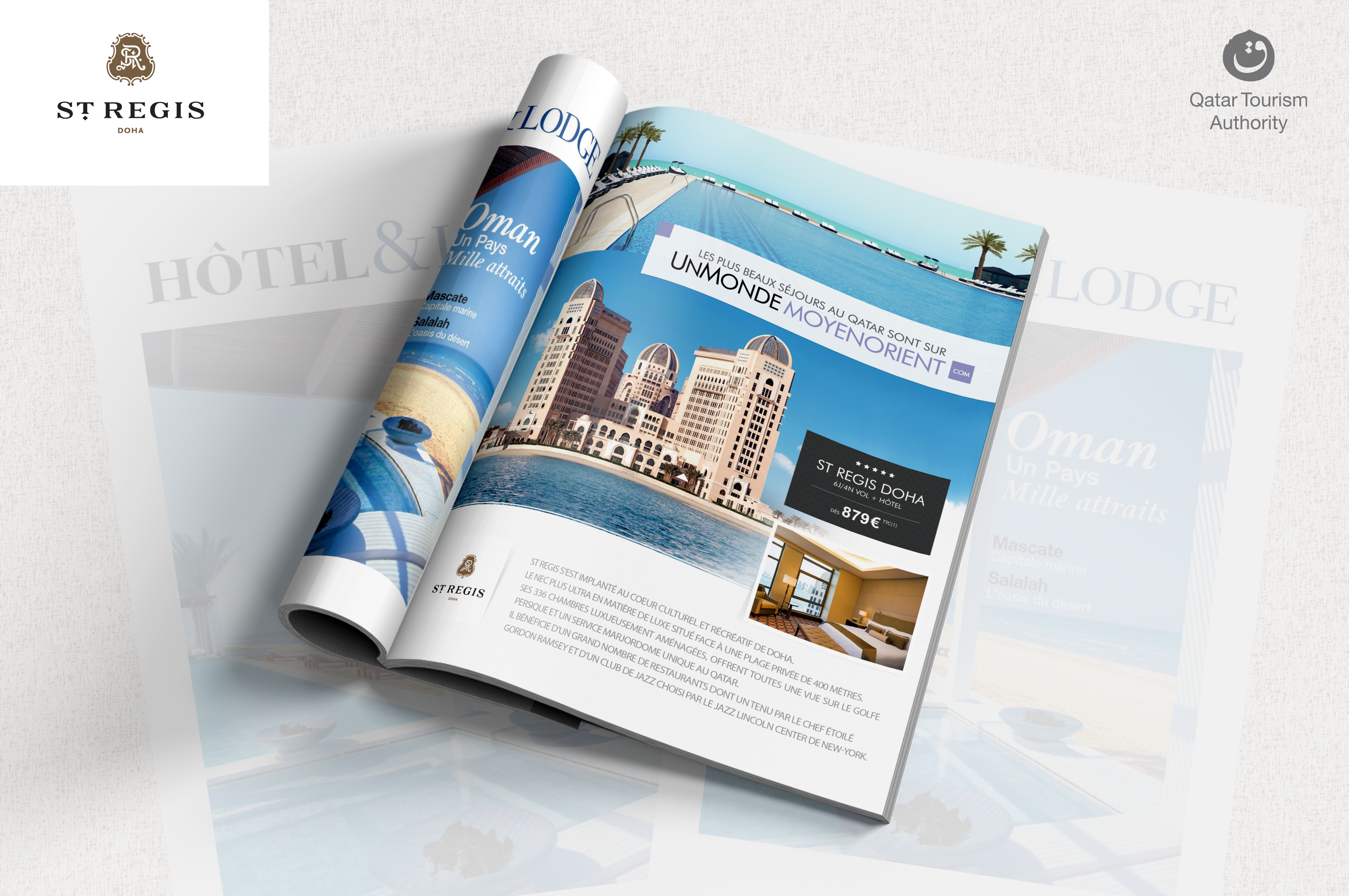 Conception d’une publicité pleine page mettant en lumière le raffinement et l’héritage du St. Regis Doha dans Hôtel & Lodge Magazine.