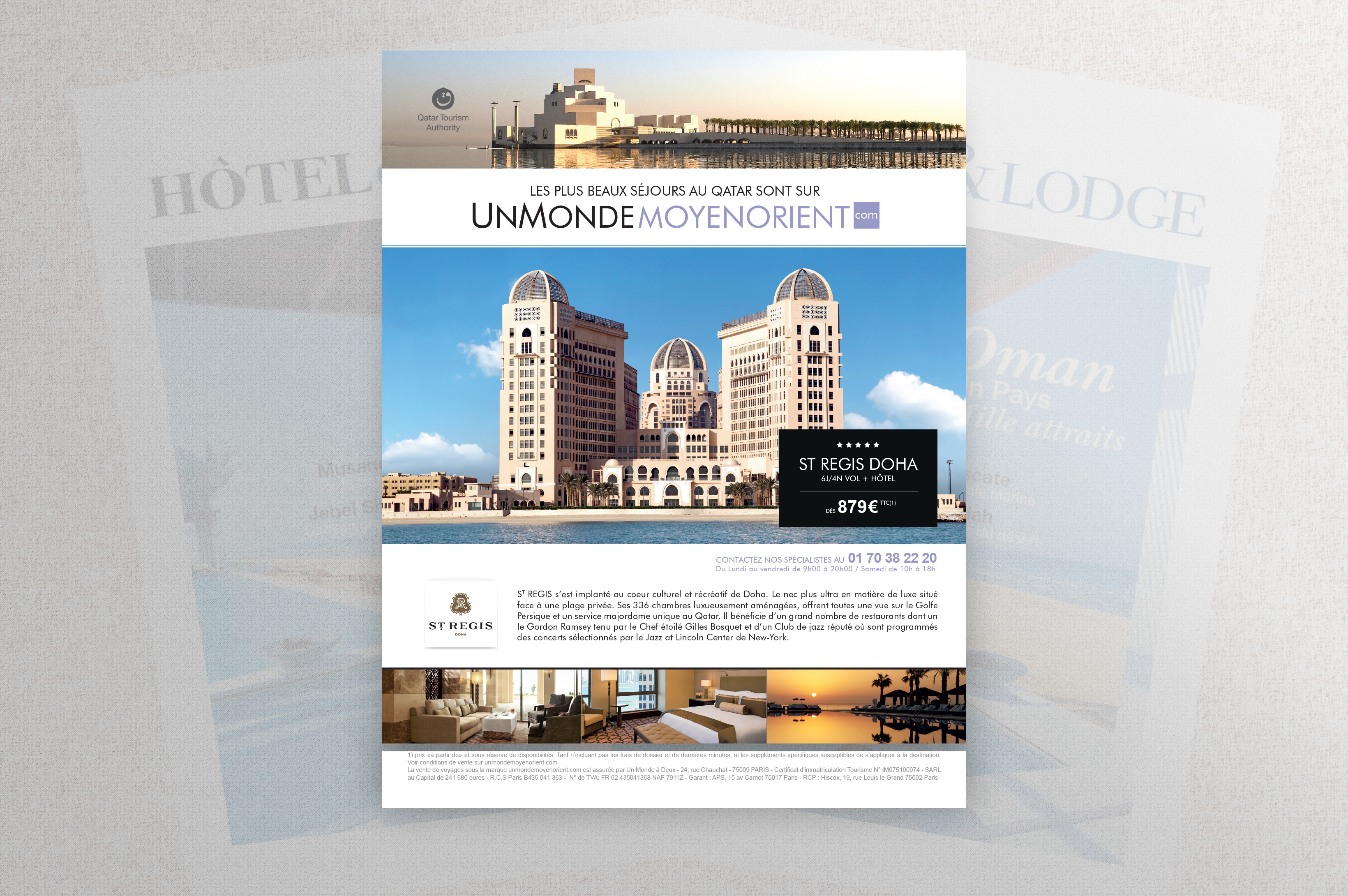 Conception d’une publicité pleine page mettant en lumière le raffinement et l’héritage du St. Regis Doha dans Hôtel & Lodge Magazine.
